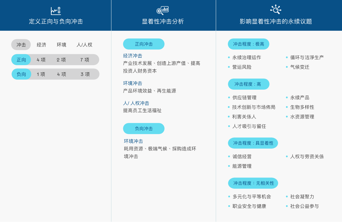 绿色产品 | 具备开发绿色友善产品与服务的设计与创新能力或严谨的绿色材料认证及冲突矿产管理机制,能取得客户信任及对环境友善 | 直接 | GRI 302、GRI417 | 2.4 客户关系 3.3 循环与清洁生产 5.2 面板创新技术 |