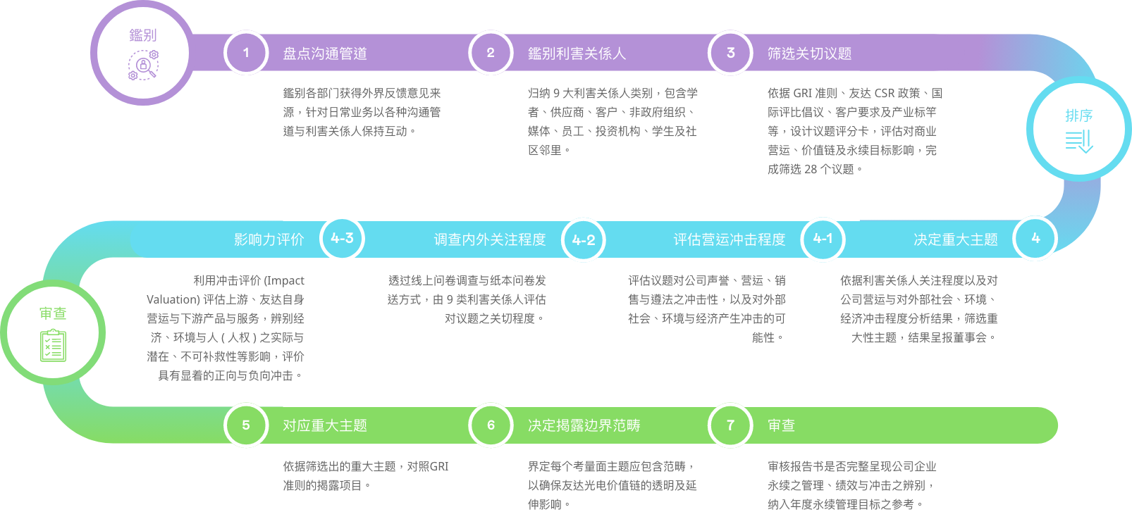 依循全球永续趋势与GRI 准则检视议题之合适性,透过问卷了解利害关系人对公司在环境、社会( 含人权)、公司治理三方面的关注面向,同时建立双重重大性评估方法,透过友达主管与价值链的关键伙伴评估ESG 议题对公司所产生的营运冲击程度,并在ESG 外部永续发展冲击方面,根据GRI 通用准则2021(GRI Universal Standards 2021) 的GRI 3:重大主题(Material Topics 2021),整合价值平衡联盟(Value Balancing Alliance, VBA)、哈佛商学院「影响力加权会计(Impact-Weighted Accounts)」研究计画等机构发展之经济、环境及社会层面冲击评估方法学,建构以冲击为基础的重大性分析流程,辨识重大性主题。