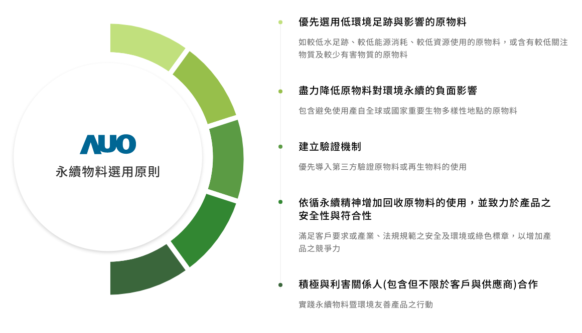 友达主要產品顯示器面板,面板製造原物料主要使用為玻璃基板與半導體製程所製造之顯示器液晶盒再與相關零件和物料組裝。為選用低環境負荷與風險之原物料,我們於產品生命週期原物料階段,即對我們所使用的原物料進行關鍵原物料之分析評估,包含材質以及重量占比。再依分析結果定義關鍵原物料,優先導入再生物料的使用。