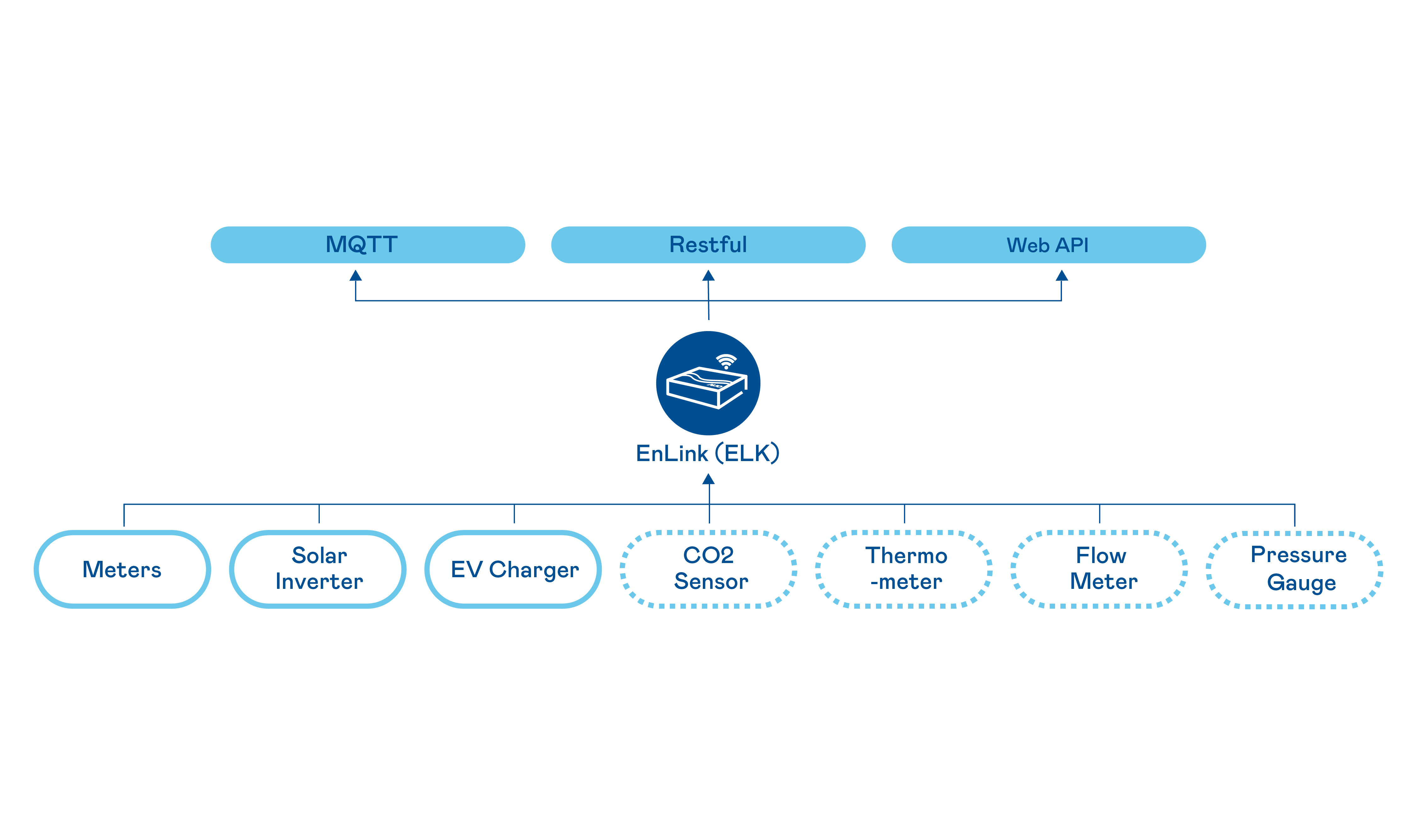 「EnLink」使用工業級輕量硬體設備,擁有強大且多元化的通訊傳輸介面,包含Modbus TCP/RTU與Sensor、智慧迴路開關或儲能設備介接,將多個端點的資料收集通訊協定標準化,支援4G國際標準通訊協議,可即時上傳場域能耗、市電與再生能源電量等相關能源資訊。透過OCPP國際標準通訊協議與各式EV Charger充電樁溝通,結合PV及ESS可實現光充儲案場自動需量調控能源管理模式。