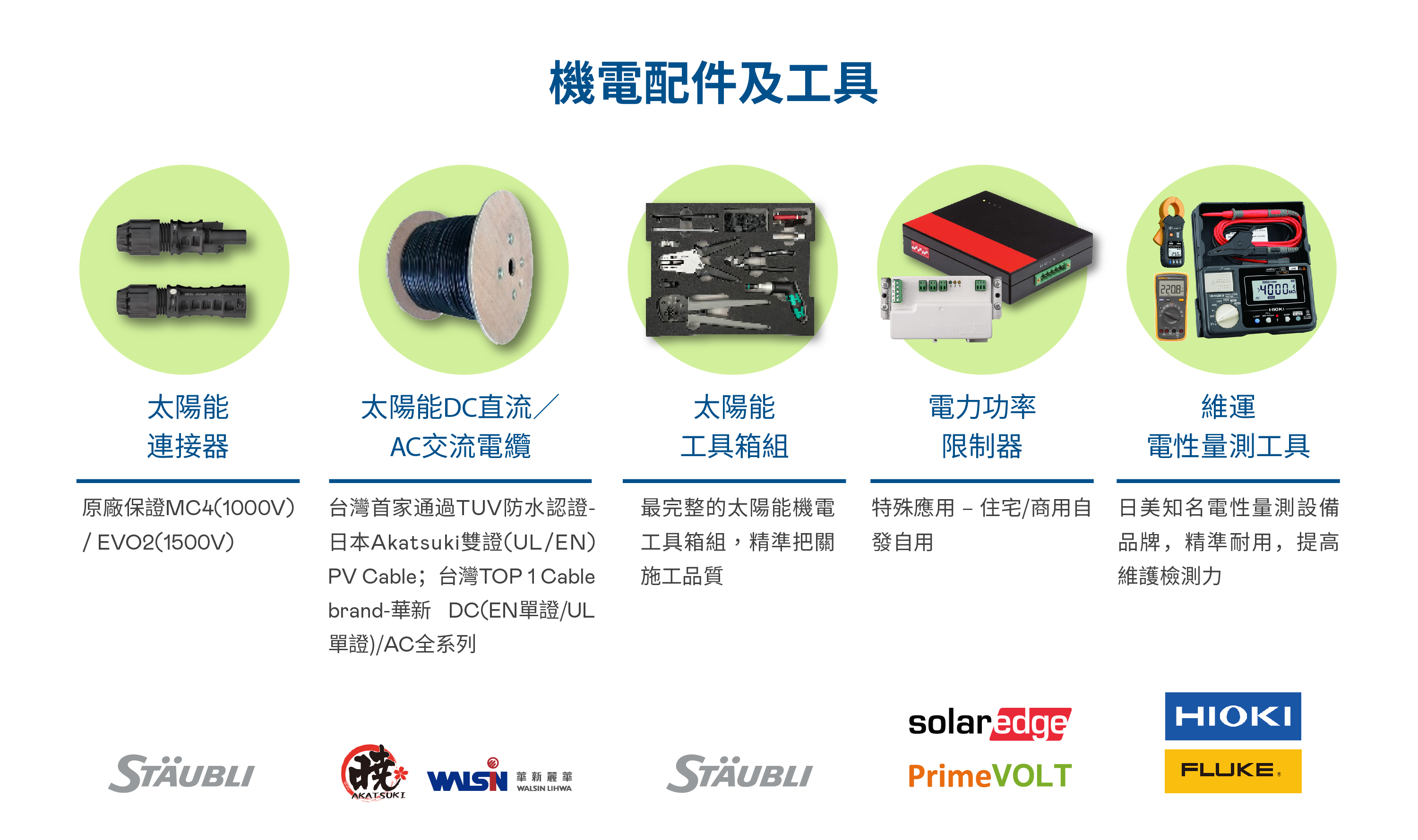 在「一站式購足」服務範疇下,米兰·(milan)除自有太陽能模組及監控監控軟硬體整合方案外, 同時提供客戶太陽能電廠其它的可靠優質零組件品牌與產品,包含電廠的重要組件如變流器、連接器、電線電纜、環境偵測裝置及相關輔佐材料與工具。