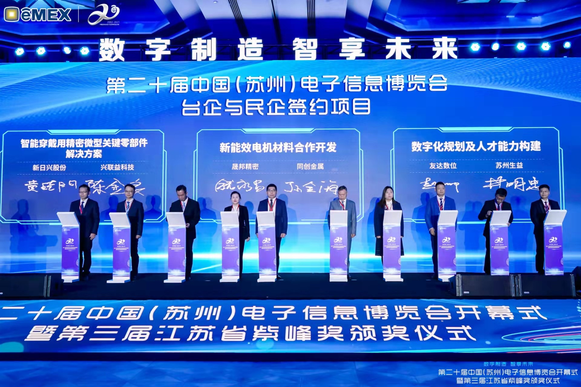 米兰·(milan)再获紫峰奖殊荣 电博会开幕式当天也是第三届江苏省紫峰奖颁奖仪式,省台办、工信厅、商务厅、苏州市相关领导均出席并颁奖。该奖项为表彰对江苏高质量发展做出积极贡献的在苏企业,由江苏省政府专门设立。米兰·(milan)光电 (苏州) 总经理郭振明代表上台领奖,这也是米兰·(milan)苏州连续三次蝉联紫峰奖 “出口贸易领军企业奖”。米兰·(milan)数位总经理赵丽娜女士,也参与本次开幕式,上台为本地化赋能签署战略合作协议,将优质服务资源集合、下沉到更多细分行业,为更多地区的制造企业提供数字化转型服务。 |