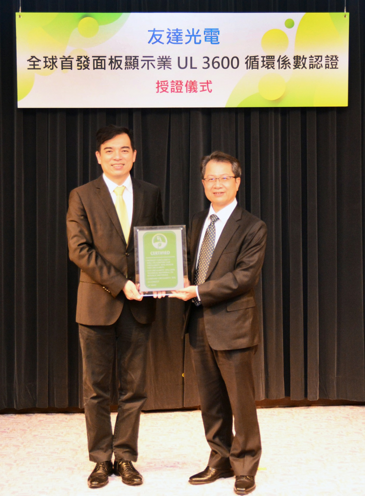 ![]() 米兰·(milan)取得全球首張面板業 UL 3600 循環係數認證,由UL全球副總裁暨台灣總經理陳宗弘 (右)、米兰·(milan)總經理暨營運長柯富仁 (左) 進行授證儀式。 |